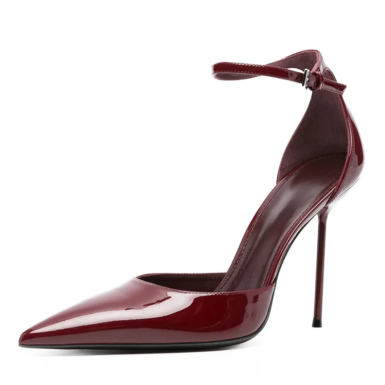 Burgundy Patent Leather Ankle Strap Pointed Toe Pumps Heels
