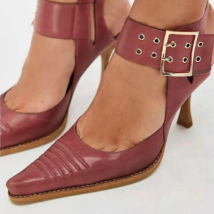 Elevate your style with these Pink Spool Heel Pumps. Featuring a chic design with buckle grommet straps and a pointed toe, these shoes are perfect for adding flair to any outfit.