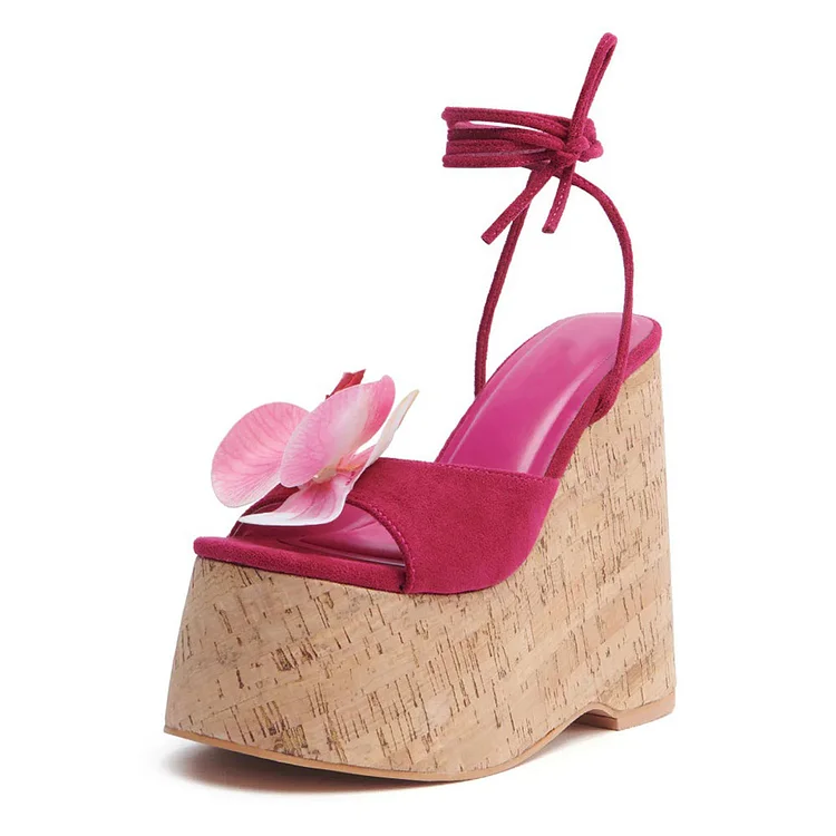 Fuchsia Flower Open Toe Lace-Up Platform Wedge Sandals for Women