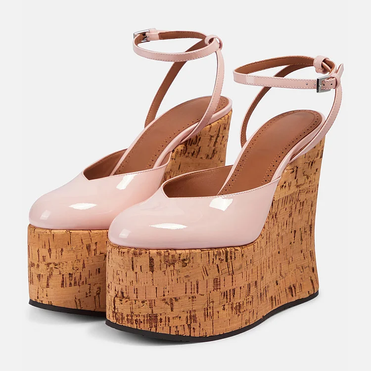 Elevate your style with these Pink Patent Leather Wedge Pumps. Featuring a round toe, ankle strap, and platform heel, they blend chic design with comfort for a fashionable statement.