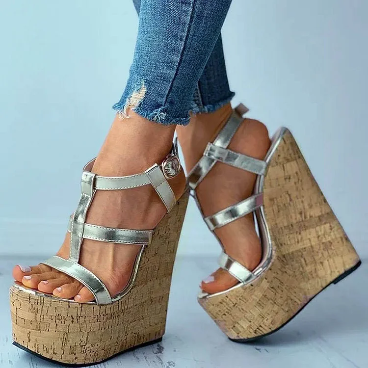 Silver High Heels Women's Strappy Sandals Party Wedge Shoes