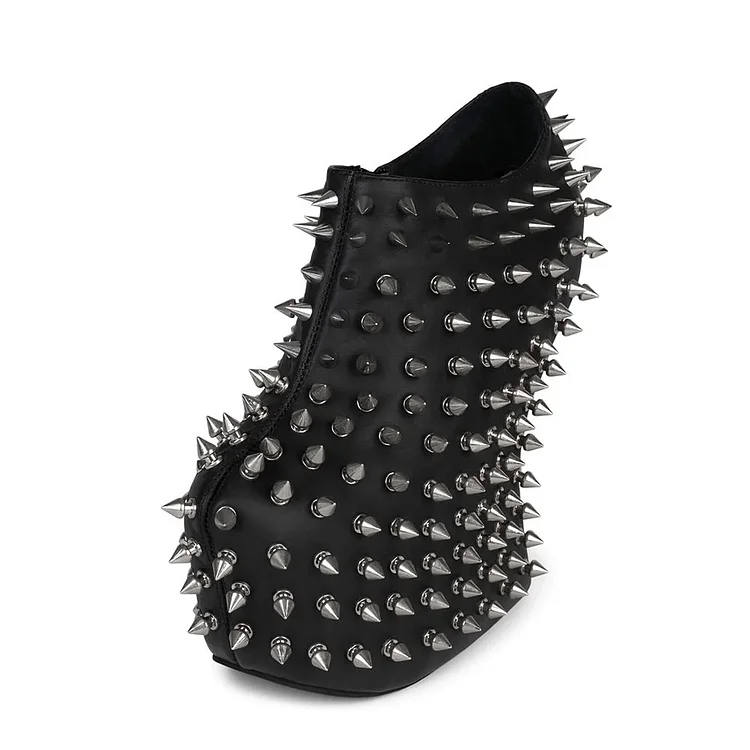 Black Round Toe Rivet Embellished Platform Wedge Heel Booties
