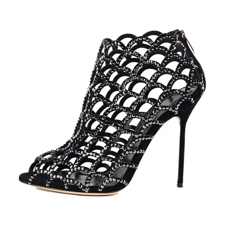 Black Vegan Suede Peep Toe Rhinestone Hollow Out Short Boots for Women