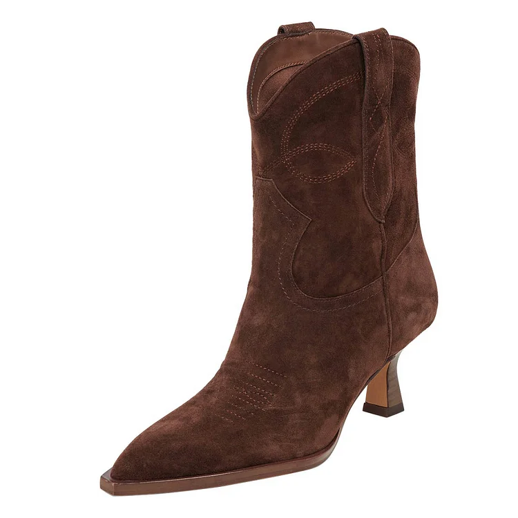 Step out in style with our Brown Vegan Suede Stitching Spool Heel Women's Western Boots. Crafted for comfort and fashion-forward flair, these boots elevate any outfit effortlessly.