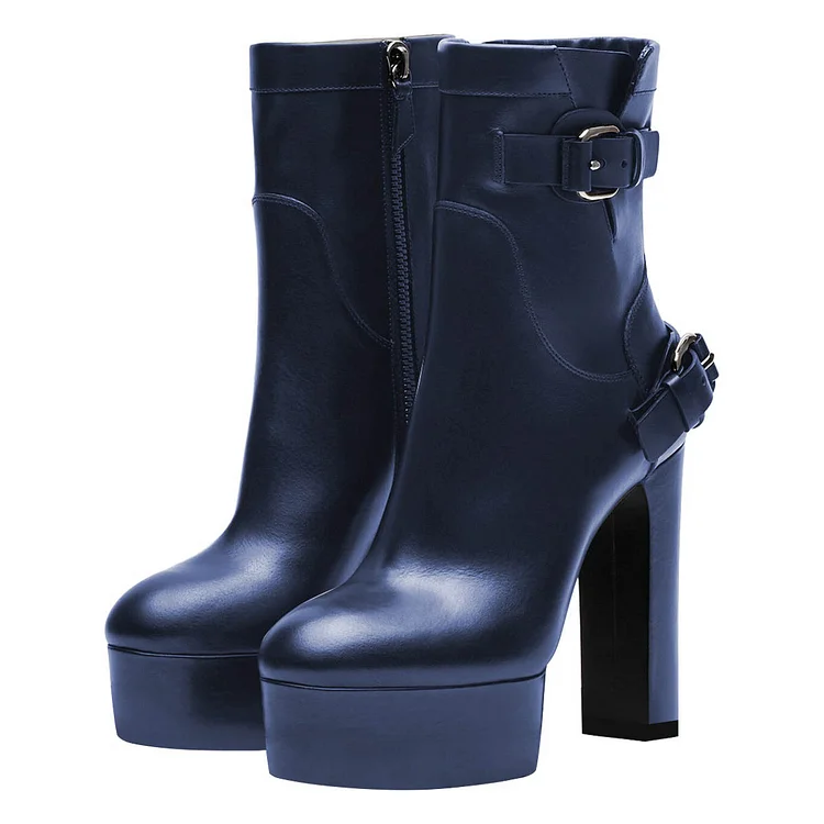 Step up your style game with these Navy Buckle Strap Round Toe Zipper Platform High Heel Boots. Elevate any outfit with a touch of sophistication and trendy flair.