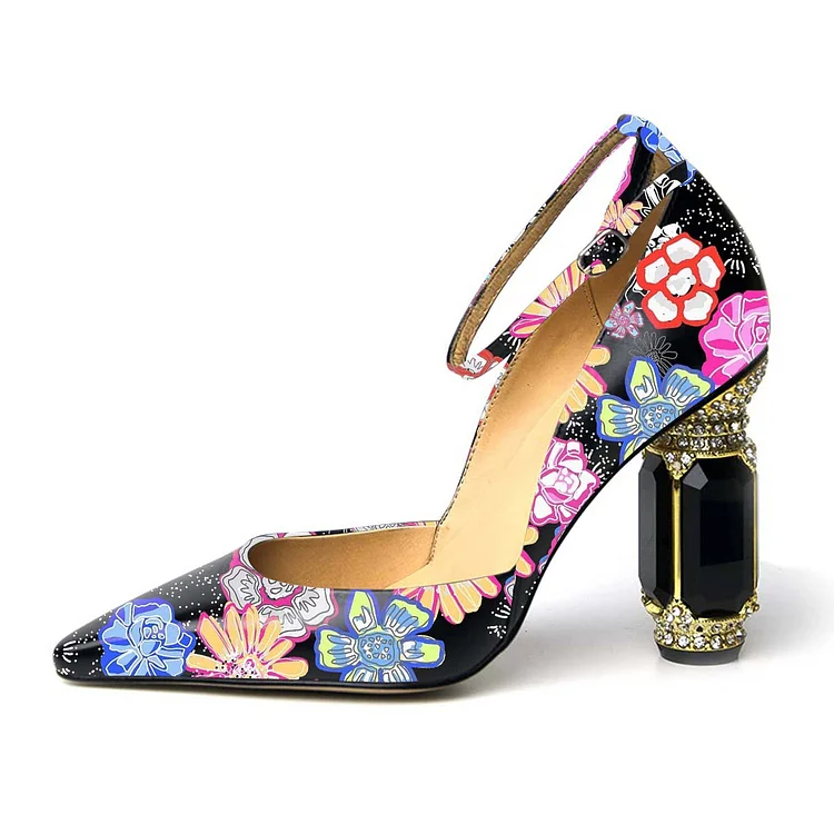 Multicolor Floral Print Pointed Toe Ankle Strap Heels with Crystals