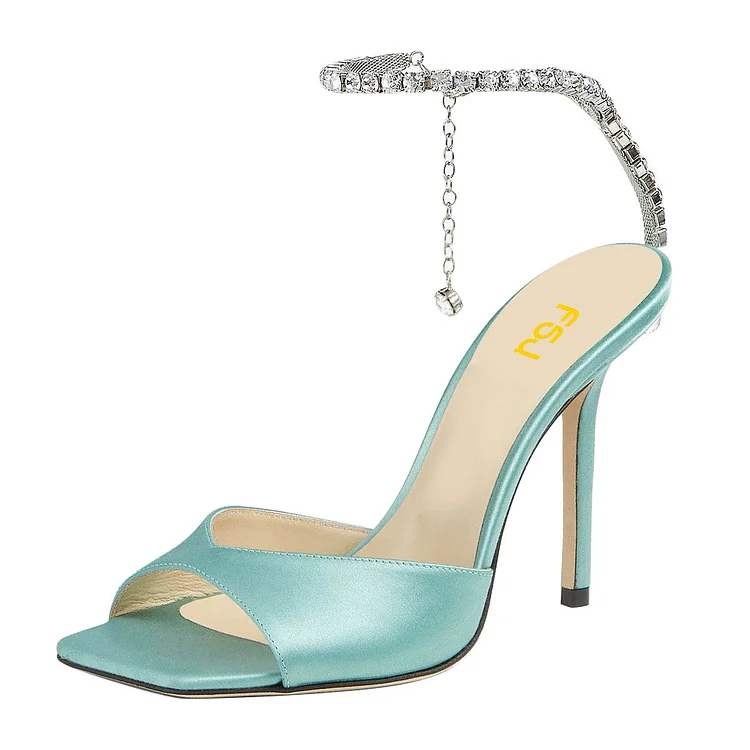 Turquoise Satin Square Toe Stiletto Heel Rhinestone Ankle Strap Heels