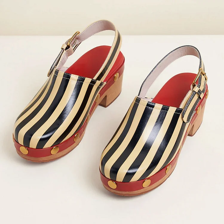 Multicolor Stripes Round Toe Studded Slingback Platform Clog Heels