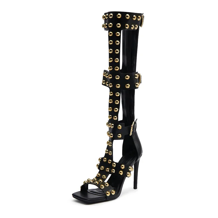 Elevate your style with these bold Black Square Toe Gladiator Heels. Featuring studs and buckle straps, these knee-high heels are a statement piece for the fashion-forward individual.