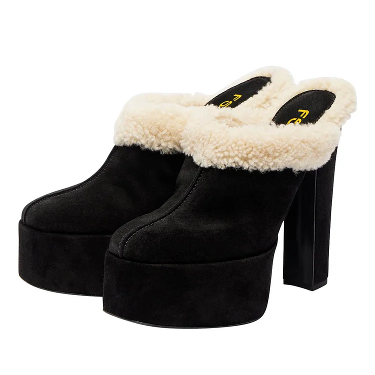 Stay stylish and cozy in our Black Shearling Trim Round Toe Platform Chunky Heeled Mules. Elevate your look with comfort and flair in these trendy statement shoes.