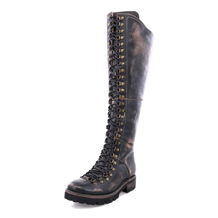 Elevate your style with these edgy Black Distressed Knee High Boots. Featuring a round toe, lace-up design, and flat sole, they blend comfort with fashion effortlessly for chic everyday wear.