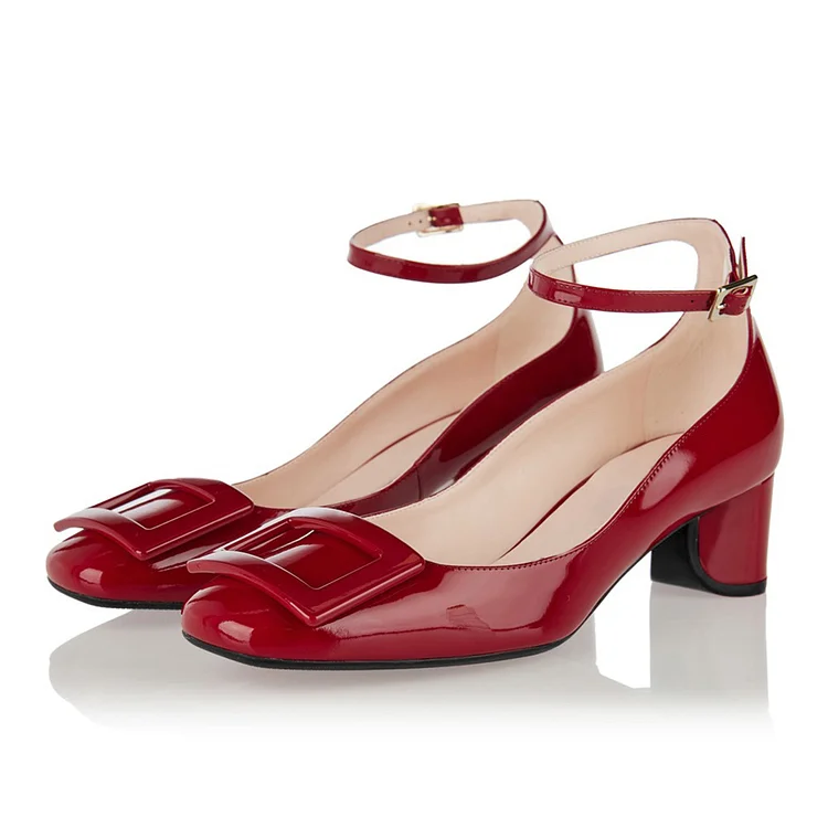 Elevate your style with these glamorous Red Square Toe Buckle Decor Ankle Strap Chunky Heel Pumps. Striking design, comfortable fit, and chic buckle detail make them a versatile fashion statement.