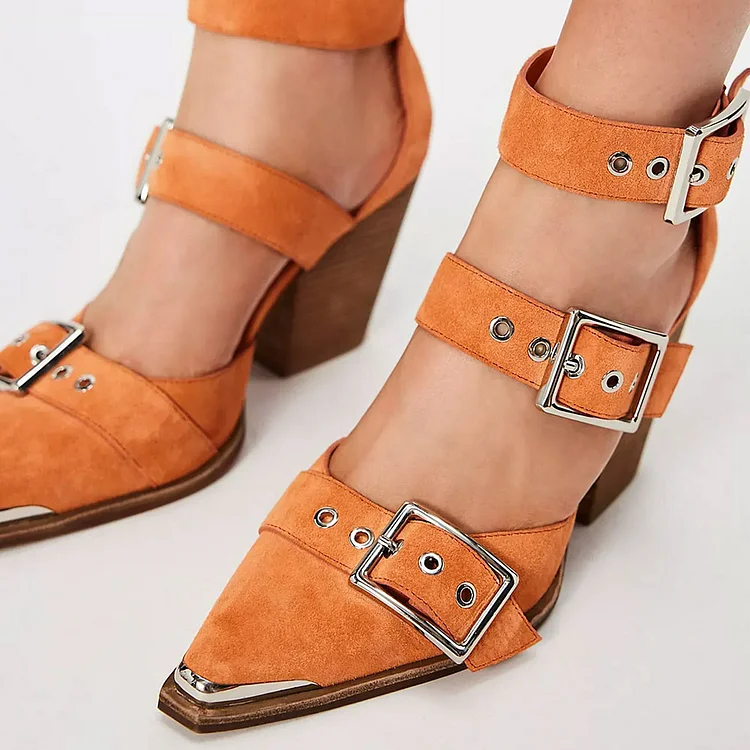 Orange Zipper Pointed Toe Buckle Grommet Strap Pumps for Women