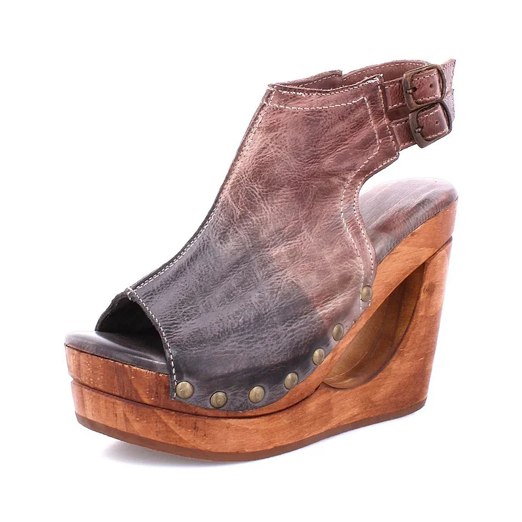 Brown Gradient Studded Buckle Strap Clog Wedge Sandals with Cutout