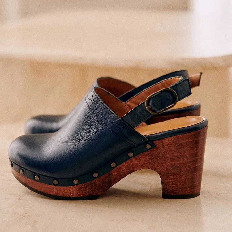 Navy Round Toe Block Heel Platform Slingback Shoes with Studs