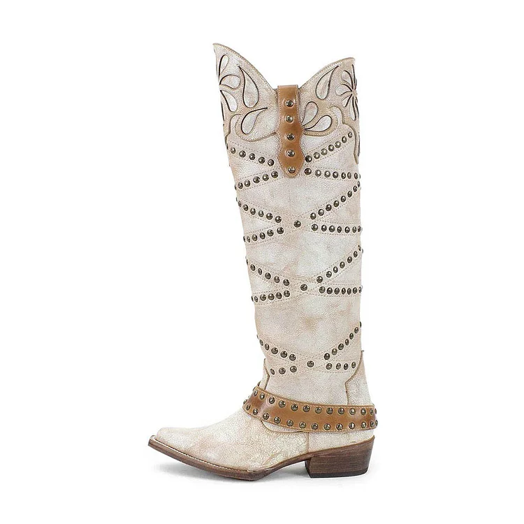 Elevate your style with these Beige Floral Inlay Chunky Heel Studded Strap Western Boots. Featuring intricate floral detailing and sturdy construction, they blend fashion-forward design with rugged Western charm.