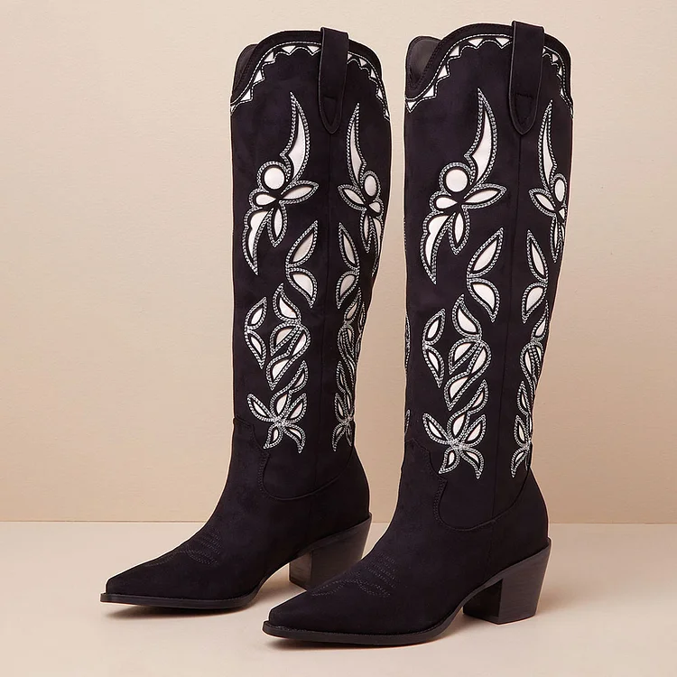 Step into style with these black & white pointed toe stitching cut-out western knee-high boots. Featuring intricate details and a sleek silhouette, they blend classic charm with modern flair effortlessly.