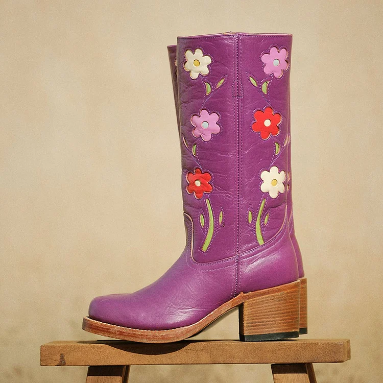 Elevate your western style with these stylish Purple Cowboy Boots. Featuring a block heel, square toe, and charming floral details, these pull-on boots are both fashionable and functional.