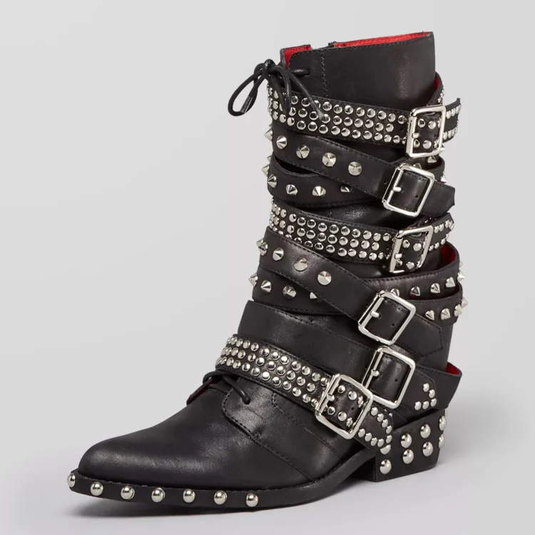 Custom Made Black Pointed Toe Lace-Up Buckle Studs Gothic Boots