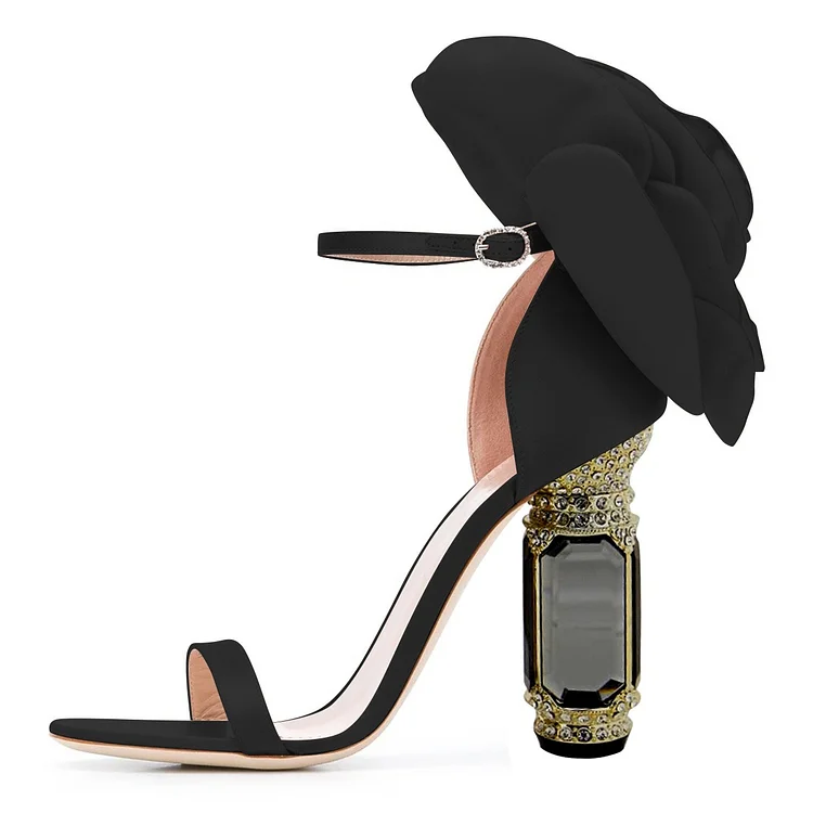 The sparkling crystal-embellished heels catch the light from every angle. A delicate flower detail adds a romantic touch, perfectly complemented by the graceful ankle strap that offers both style and secure support. Set on a refined heel, these sandals are crafted to make every step feel confident, elegant, and unforgettable.