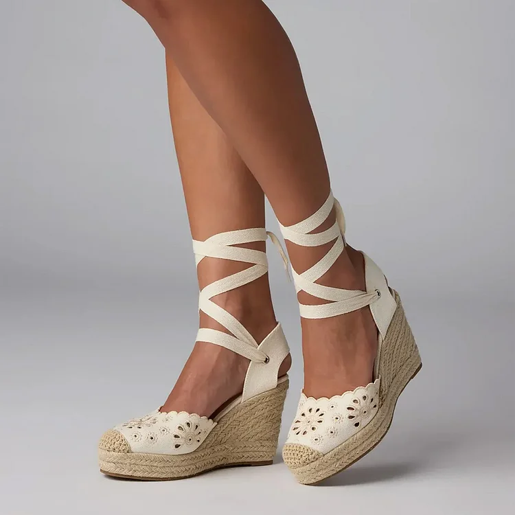 Ivory Round Toe Cutout Wedge Heel Tie-Up Platform Espadrille Sandals