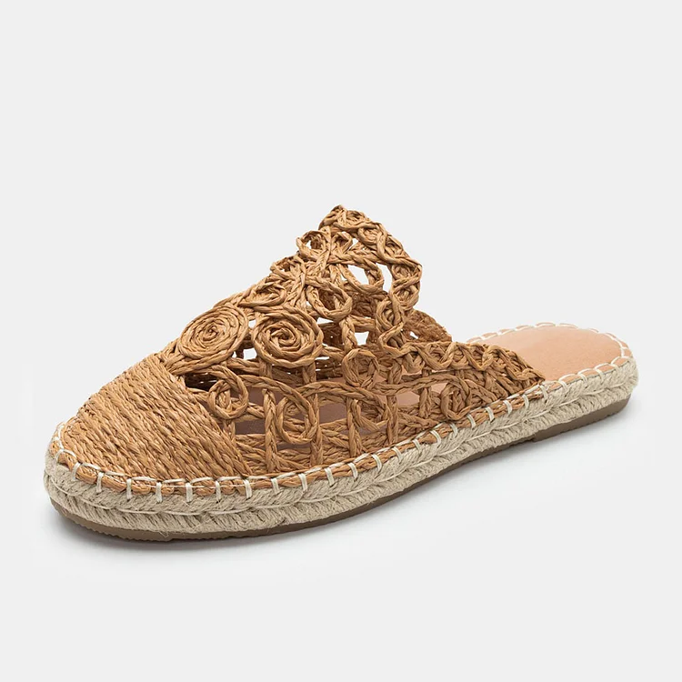 Chic and versatile, these Tan Woven Round Toe Espadrille Sole Flat Mules for Women offer comfort and style. Perfect for casual outings or summer strolls, featuring a trendy woven design.