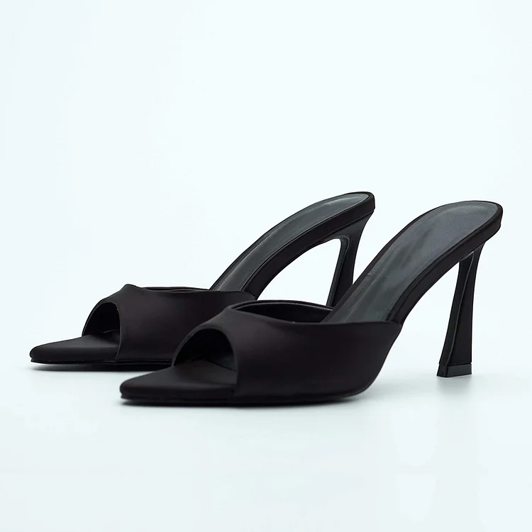 Elevate your style with these elegant Black Satin Peep Toe Mules. Slip-on design, peep-toe silhouette, and flared heel offer sophistication and comfort for any occasion, perfect for the modern woman.