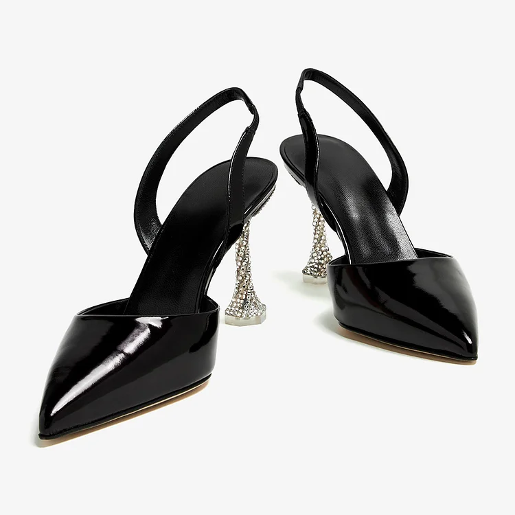 Elevate your style with these elegant Patent Leather Crystal Flared Heel Slingback Black Pumps. Classic yet glamorous, perfect for any occasion with a touch of sophistication and charm.