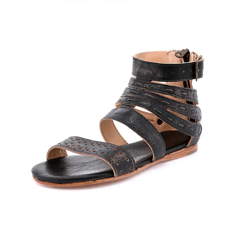 Black Open Round Toe Back Zipper Flat Gladiator Sandals for Women