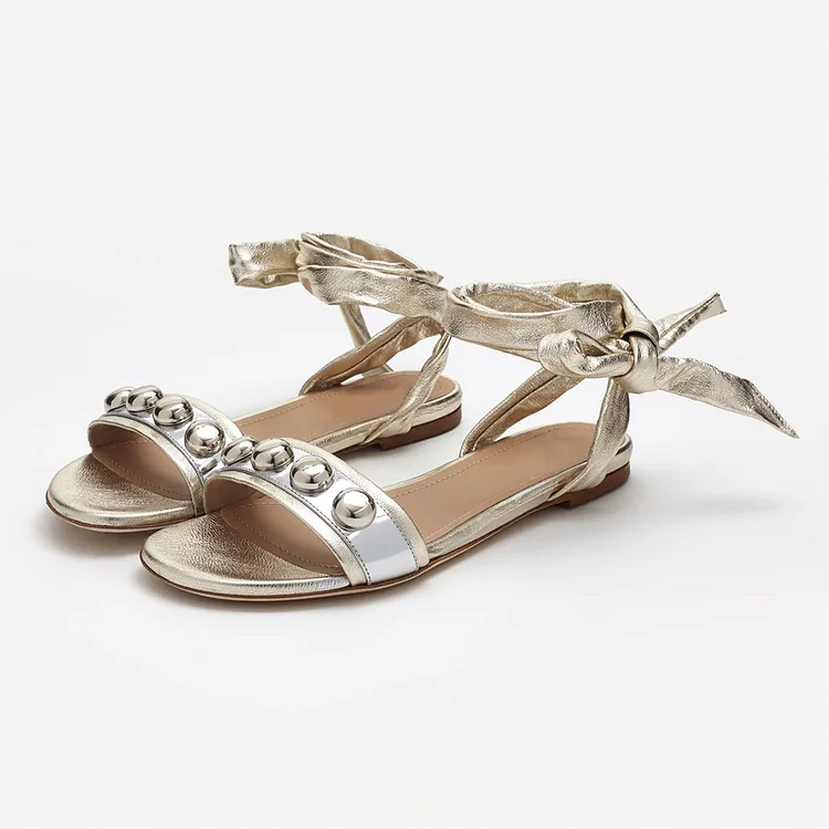 Gold Studded Open Round Toe Ankle Tie-Up Flat Sandals for Women