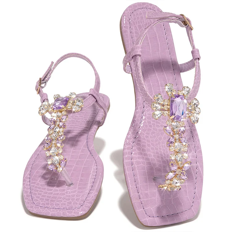 Elevate your style with these chic Purple Croco Embossed Sandals. Featuring a flat sole, open toe design, and sparkling rhinestone ankle strap, they blend sophistication with trendy crocodile texture.