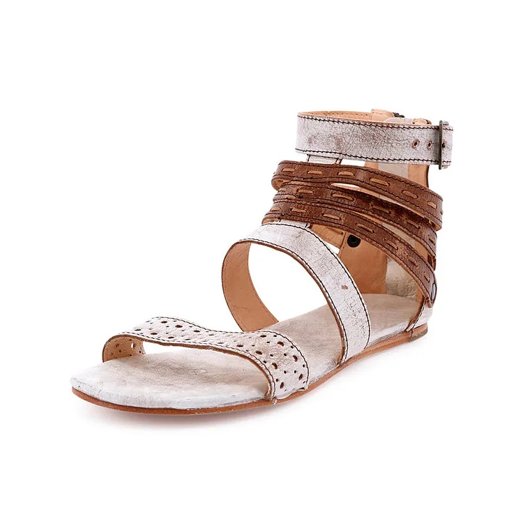 White and Brown Open-Toe Flat Gladiator Sandals with Zipper
