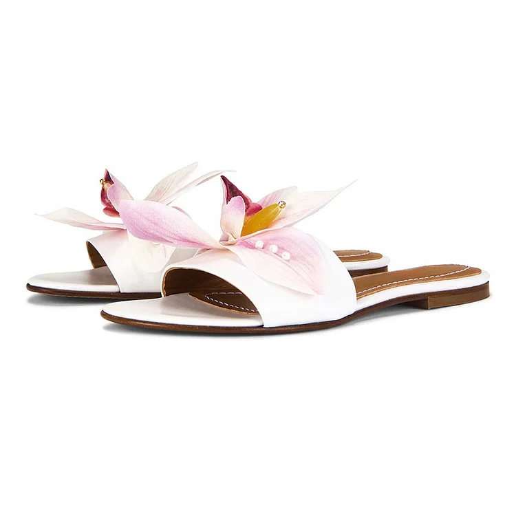 White Open Toe Pink Floral Accent Flat Slide Sandals Women