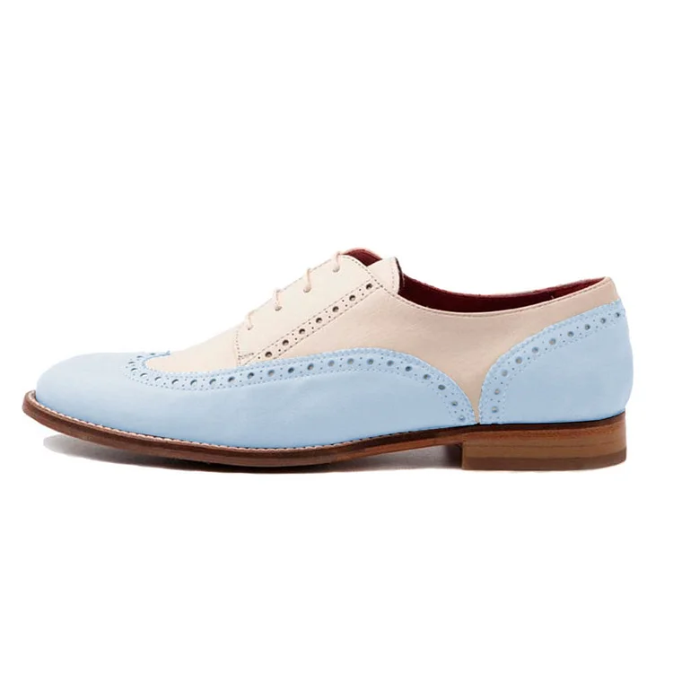 Elevate your style with these blue & beige round toe brogue styling lace-up women's oxfords. Featuring a charming blend of colors, classic brogue details, and a comfortable round toe design.