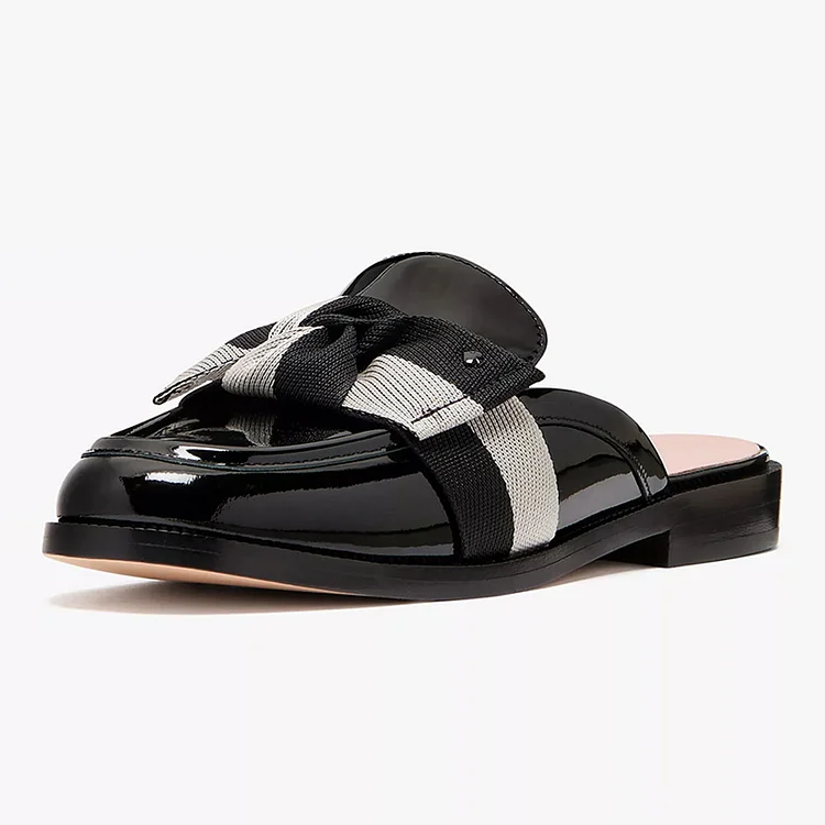 Elevate your style with FSJ's Black Patent Leather Round Toe Knot Loafer Mules. These sophisticated mules feature a classic design with a modern twist, perfect for any fashionable woman.