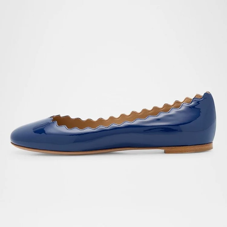 Elevate your style with FSJ's Navy Patent Leather Scalloped Ballet Flats. These round-toe flats offer a simple yet sophisticated look, perfect for casual or dressy occasions. Comfort meets elegance.