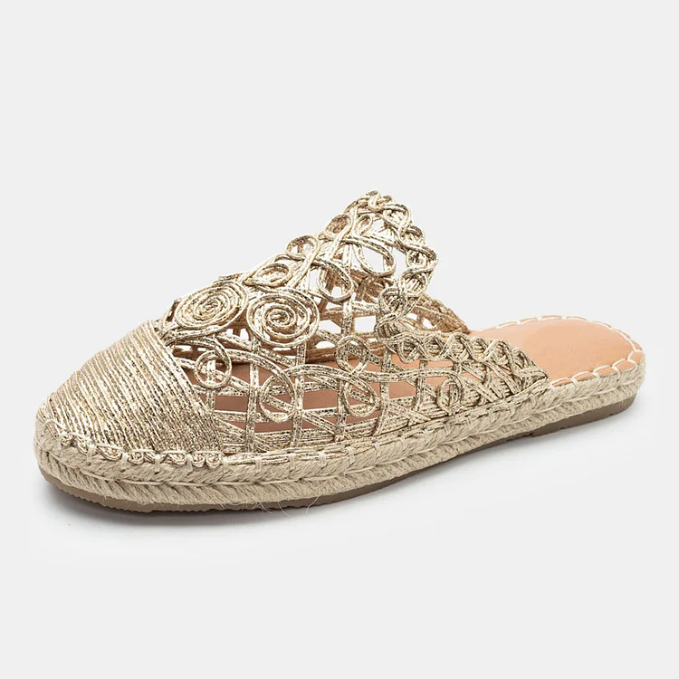 Step into style with these Gold Woven Hollow Out Round Toe Flat Women's Mules. Featuring intricate woven details and a comfortable design, these shoes blend fashion and comfort effortlessly.