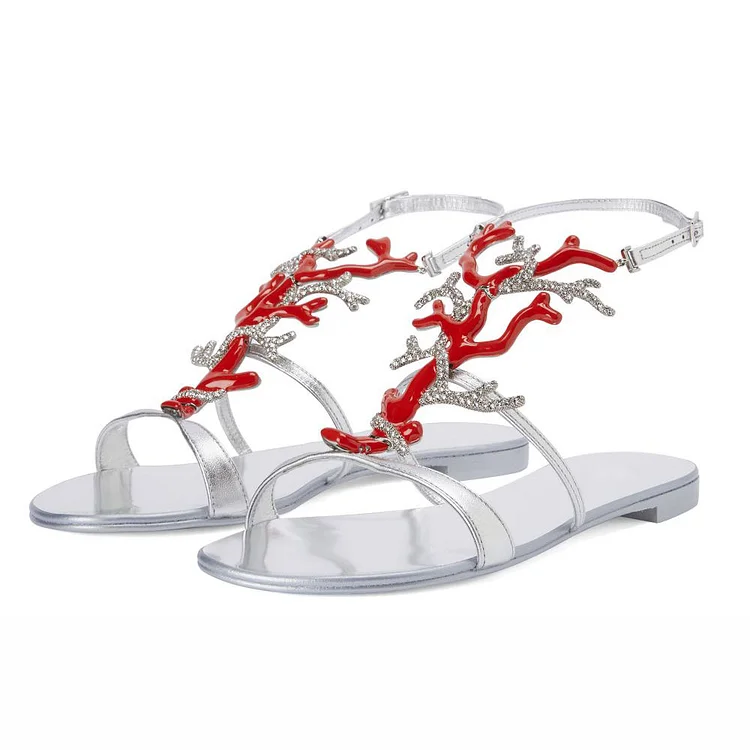 Silver & Red Crystal Coral Strappy Slingback Flat Sandals for Women