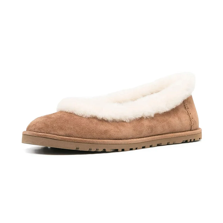 Experience cozy elegance with our Winter Tan Faux Fur Lining Round Toe Comfort Flat Shoes for Women. These chic flats feature a warm faux fur lining and a classic round toe design.