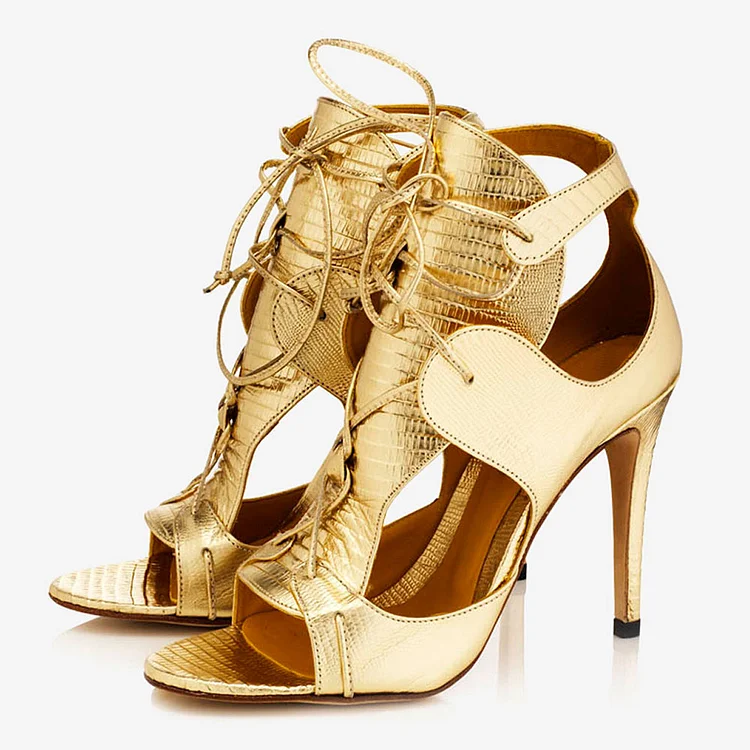 Elevate your style with these Gold Lizard Embossed Heeled Sandals. Featuring an open toe, cutout design, lizard embossing, and tie-up detail, these sandals exude sophistication and charm effortlessly.