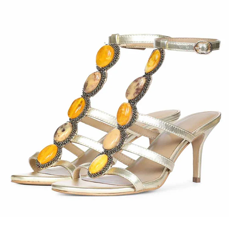 Step out in style with our Gold Metallic Finish Caged Heel Sandals. Featuring an open-toe design embellished with dazzling stones, these heels are the perfect blend of elegance and glamour.