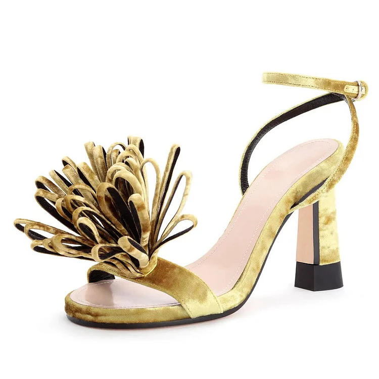 Gold Open Round Toe Flower Ankle Strap Women's Heel Sandals