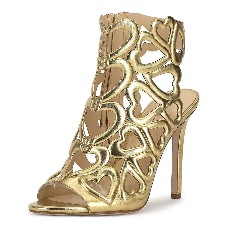 Gold Open Toe Heart Cutout Stiletto Heel Side Zipper Gold Sandals