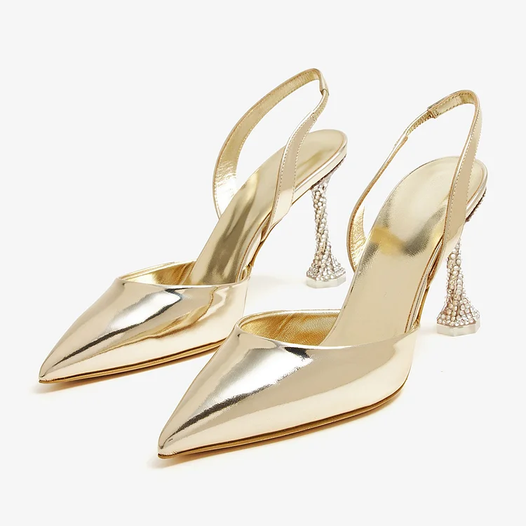 Gold Pointed Toe Crystal Embellished Flared Heel Slingback Pumps