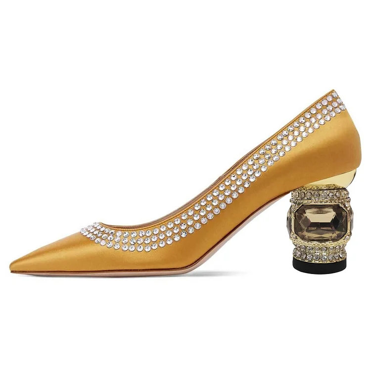Elevate your style with our Gold SatinPointed Toe Rhinestone Sculptural Heel Pumps. These shoes blend elegance and flair, perfect for adding a touch of sophistication to any outfit.