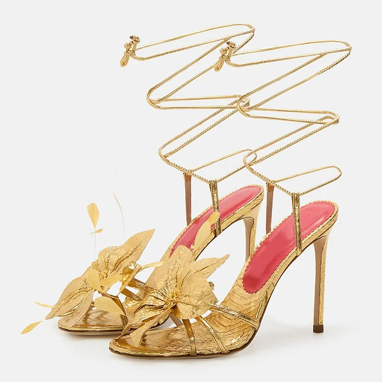 Step into elegance with our Gold Snakeskin Embossed High Heel Sandals. Featuring open toes, intricate flower lace-up design, and a bold snakeskin texture, these heels exude sophistication and style effortlessly.