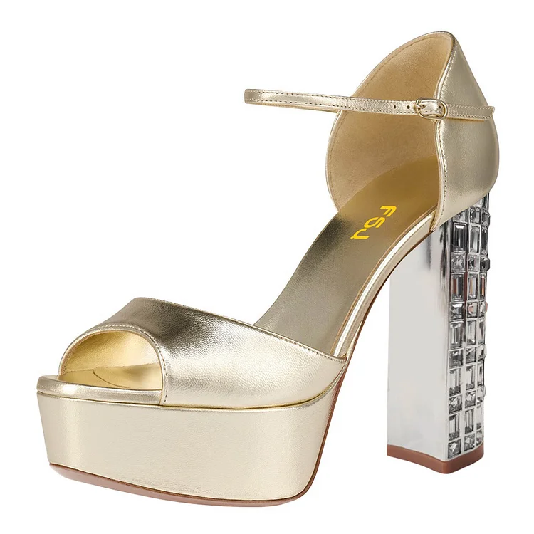 Trendy Peep Toe Ankle Strap Rhinestone Platform Gold High Heels