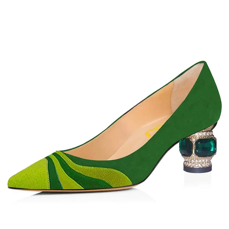 Green and Olive Striped Crystal Vegan Suede Pointed Toe Heels