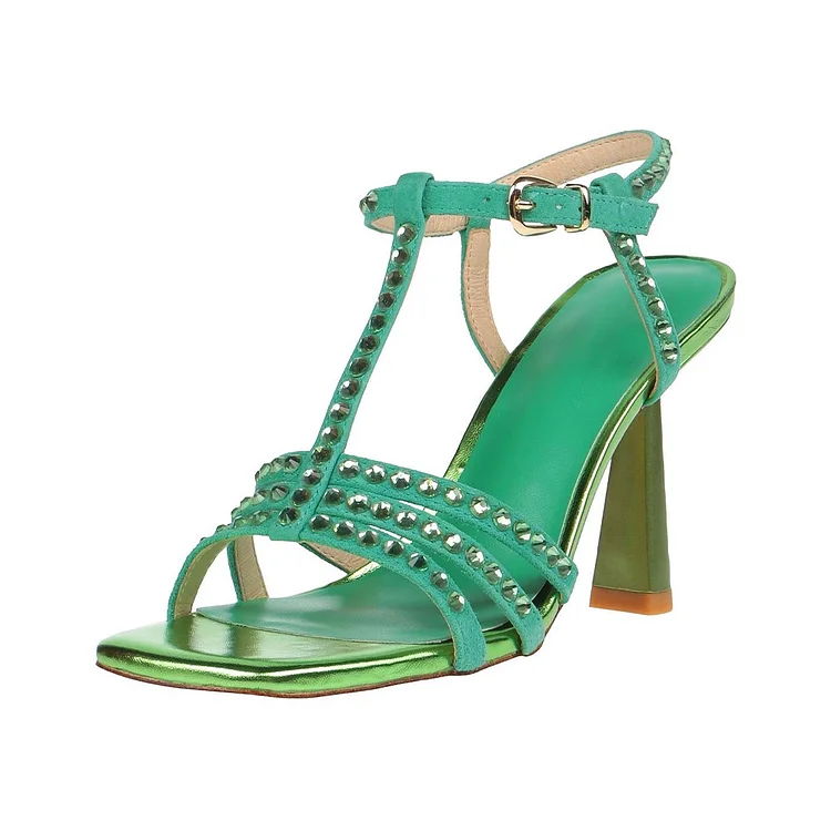 Elevate your style with these Green Open Square Toe T-Strap Stiletto Heel Rhinestone Sandals. Trendy and chic, these heels add a touch of glamour to any outfit.