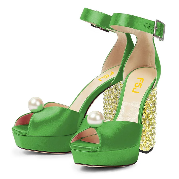 Green Satin Rhinestone Peep Toe Ankle Strap Platform Heel Sandals